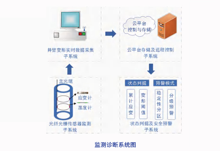 通過在井壁和罐道上安裝光纖傳感器,并與監測室中光纖解調儀相連,采集井壁和罐道變形的環向應變和軸向應變數據,實現井壁和罐道變形的實時監測。