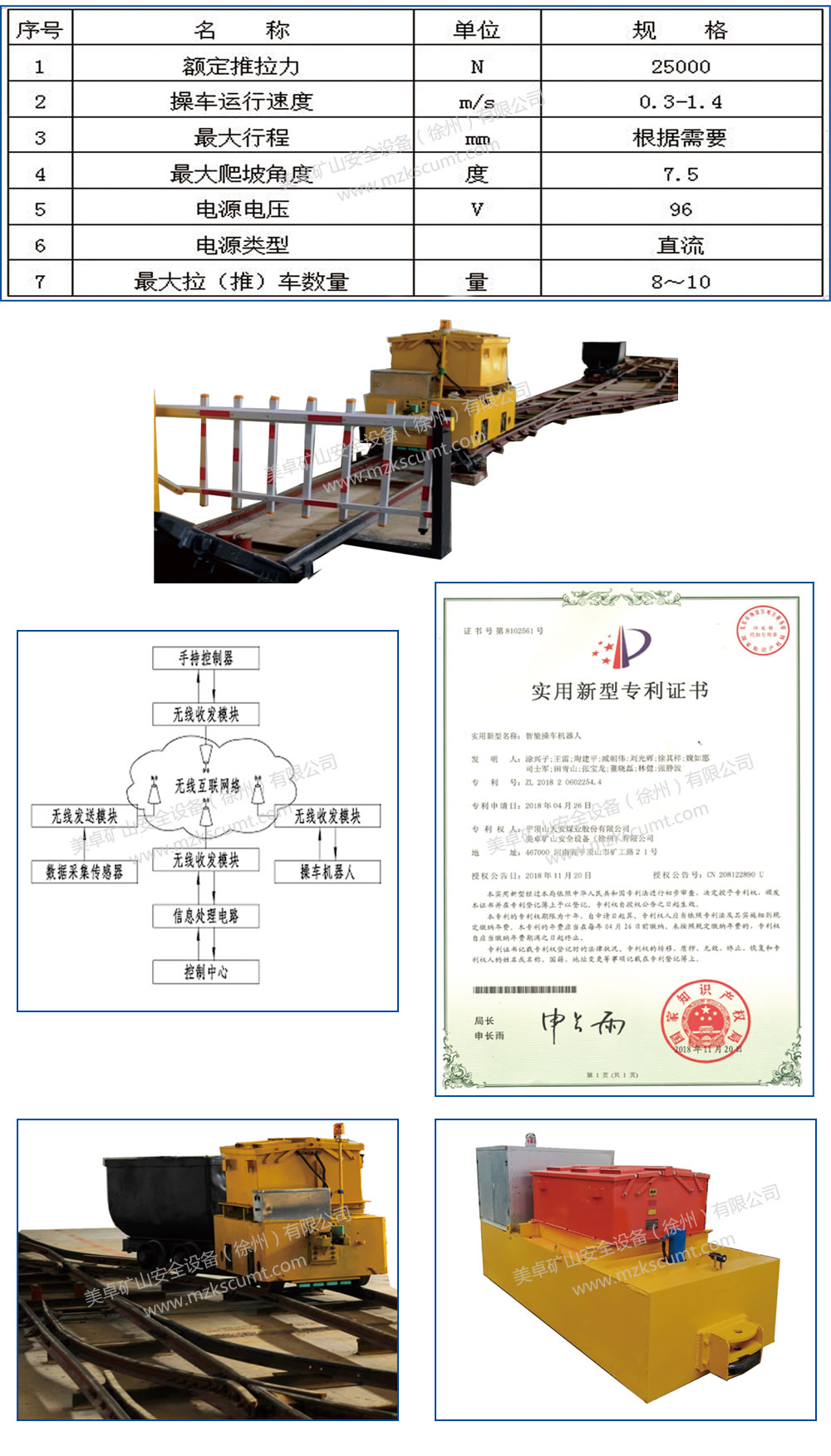 7)推拉機器人與一臺礦車尺寸相仿,可像礦車一樣進入罐籠,移動方便,凡礦車能夠運行的彎道它都能快速通過。可多水平使用。